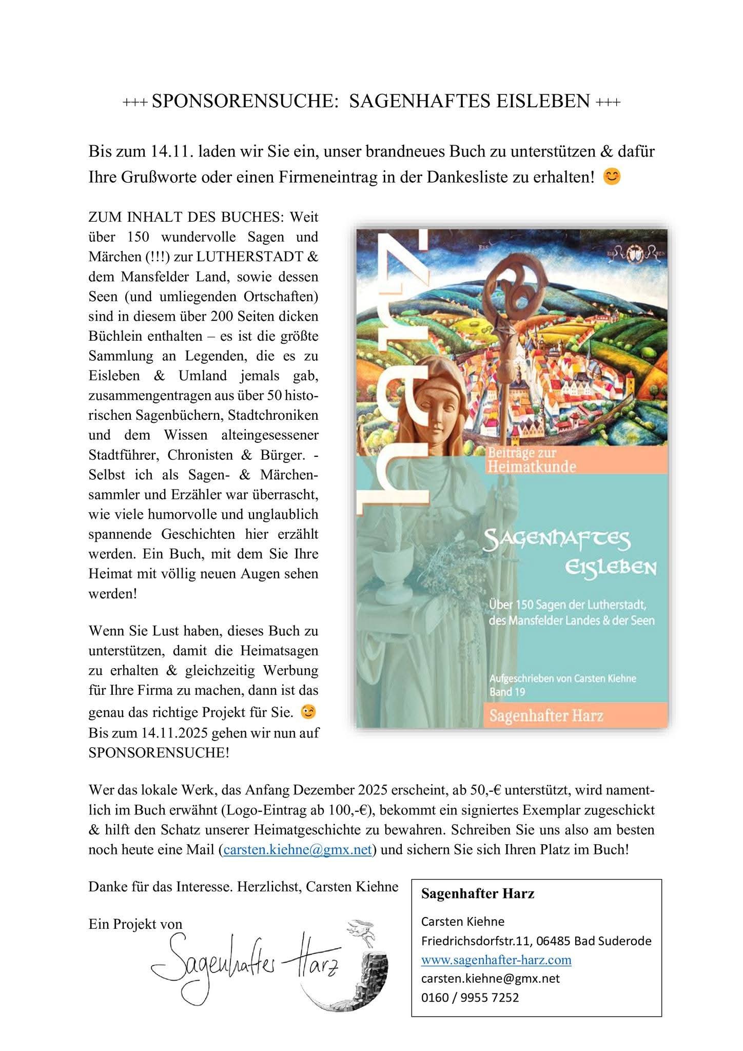 SPONSOREN GESUCHT: Das neue Buch „SAGENHAFTES EISLEBEN“ mit den Sagen der Lutherstadt, des Mansfelder Landes & der Seen erscheint noch im Dezember 2025